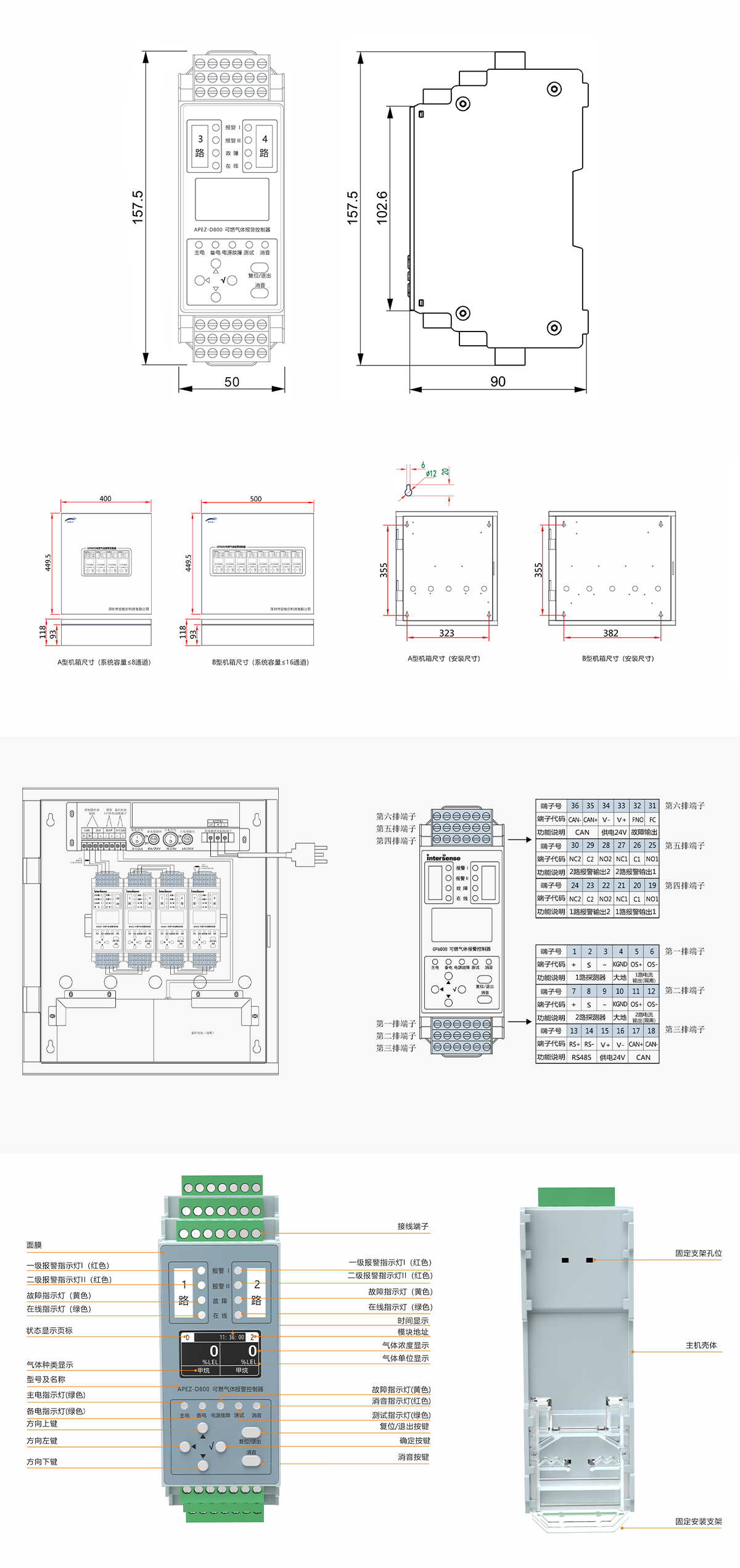每單元1個(gè)總故障繼電器,1個(gè)RS485( Modbus),2通道電流輸出;每通道有各自的低警繼電器、高警繼電器 |